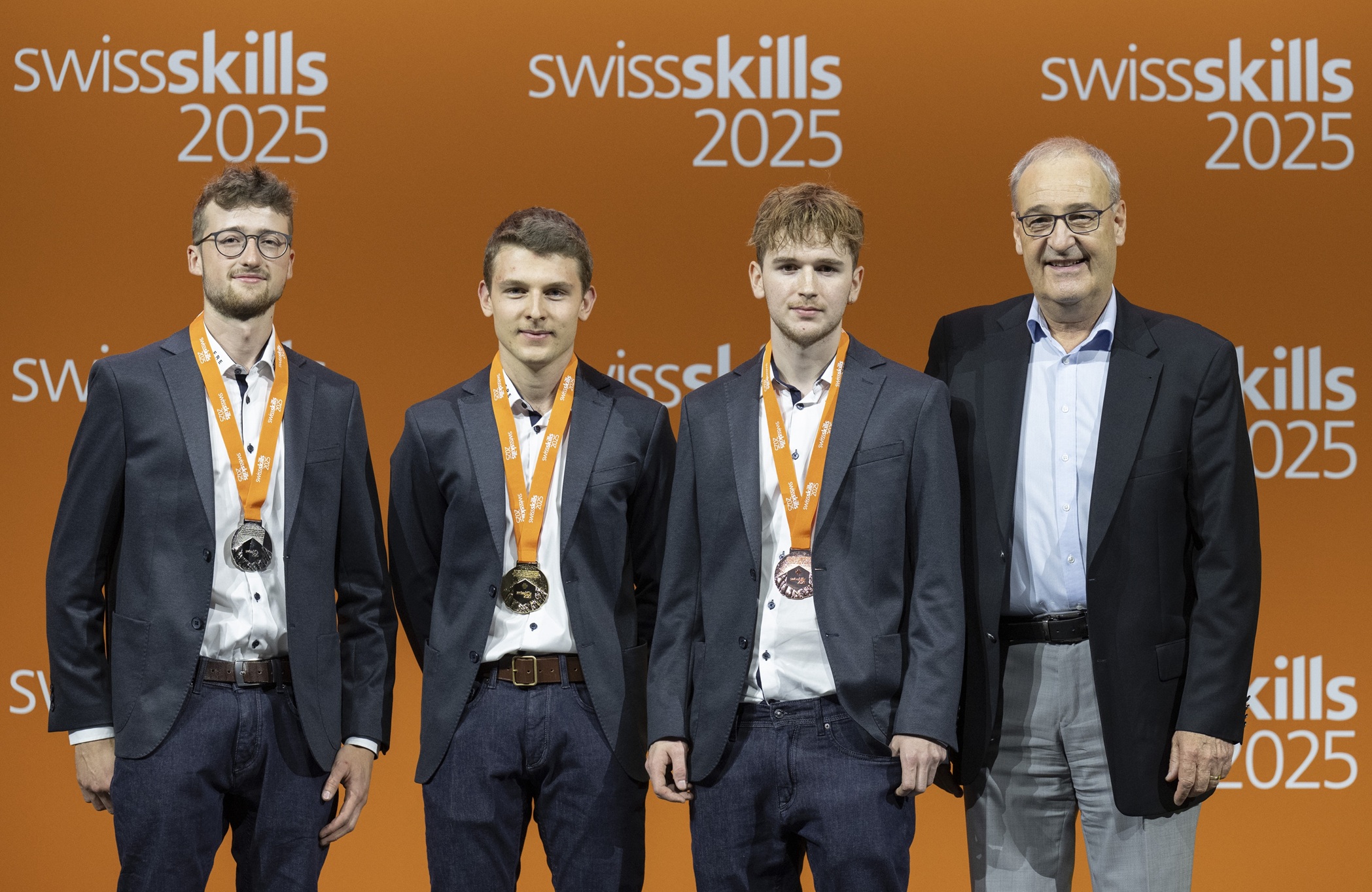 Bild, von Links nach Rechts: Bundesrat Guy Parmelin, Florian Muri, Elmar Wyrsch, Loïc Santschi