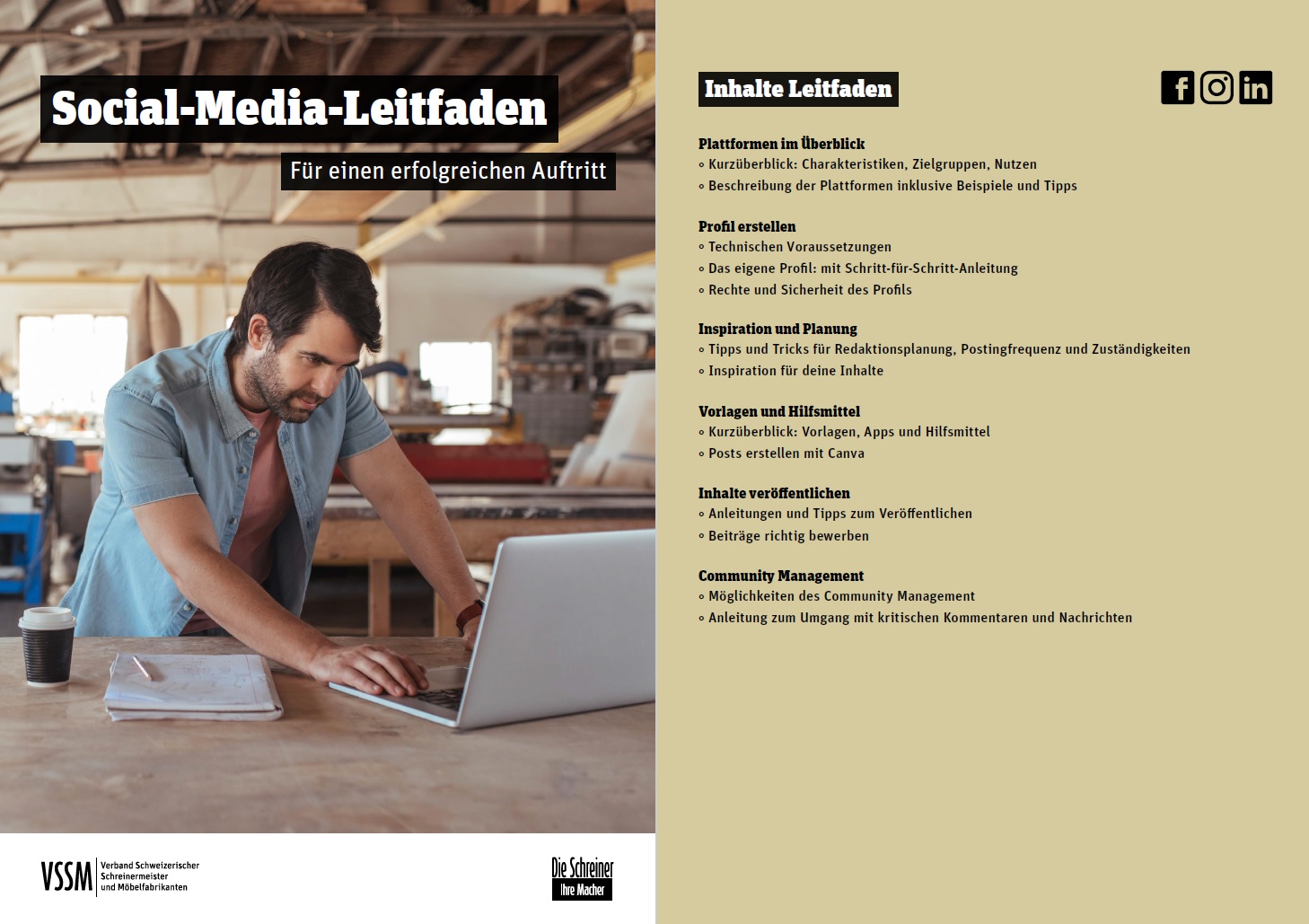 Social Media wird auch bei der Kunden- und Nachwuchsgewinnung immer wichtiger. Um das Thema in der Schreinerbranche noch besser zu verankern, haben wir einen «Social-Media-Leitfaden» für unsere Mitgliedsbetriebe entwickelt. Dieser unterstützt sie bei ihrer täglichen Arbeit mit den nötigen Grundlagen, Hilfsmitteln und Umsetzungsideen.