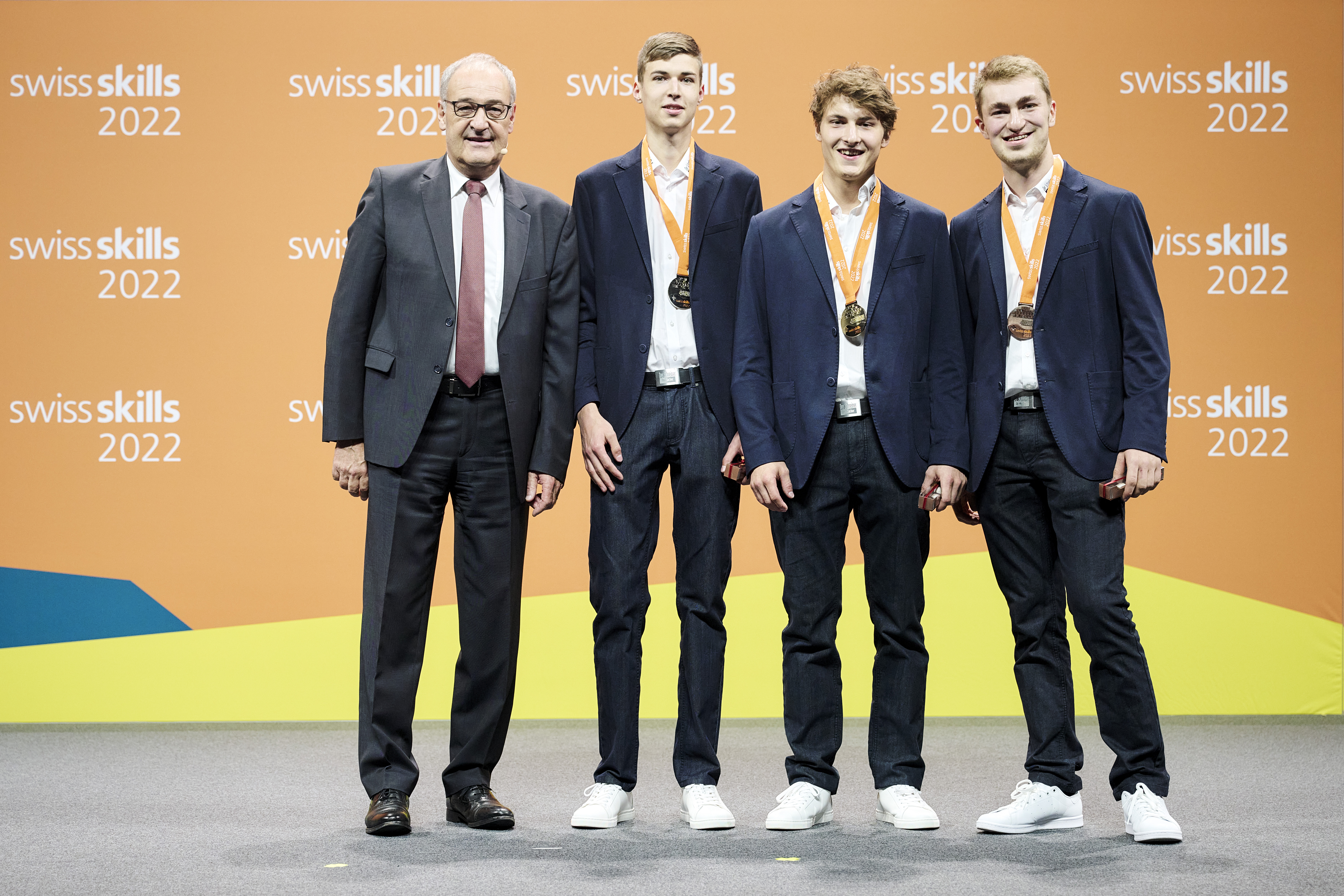Bild, von Links nach Rechts: Bundesrat  Guy Parmelin, Florian Muri, Elmar Wyrsch, Loïc Santschi