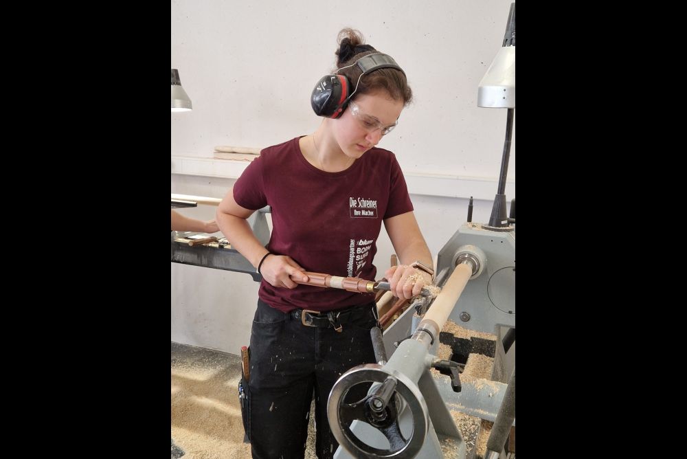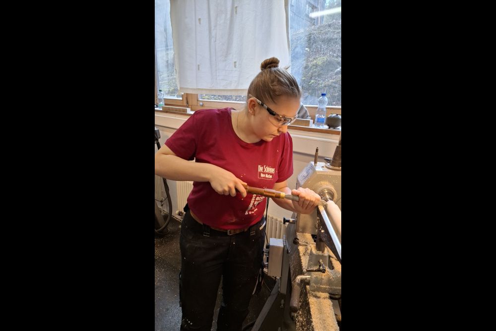 Bei den Frauenpower-Workshops 2025 in Hofstetten BE stellten 33 Lernende Hocker her. Sie haben einen Tag geschreinert und einen Tag gedrechselt, was für die meisten neu war. Die Sitzfläche des Hockers musste Rundungen aufweisen, da diese mithilfe des Oberfräsenzirkels herausgefräst werden sollten. In die Sitzflächen wurden dekorative Furnierstreifen eingelassen. Über das Design konnten die jungen Frauen frei entscheiden.