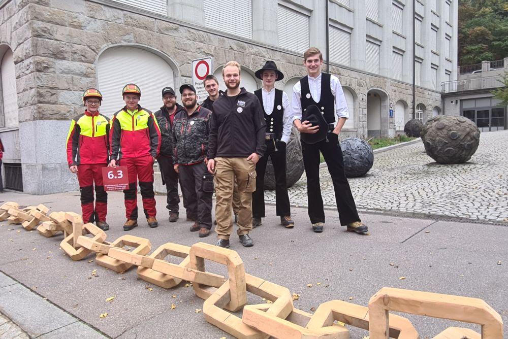 Symbolisch für unsere Vision, die Holzkette unter einem Dach zu vereinen, wurde die 8 Meter lange Arven-Holzkette welche vor über 20 Jahren erstellt wurde, von Forstwarten, Sägern, Zimmermännern und Schreinern in ihrer jeweiligen Arbeitsbekleidung stolz durch die Innenstadt getragen. Es soll ein Zeichen setzen: Zusammen können die "Hölzigen" alles schaffen und Berge versetzen.