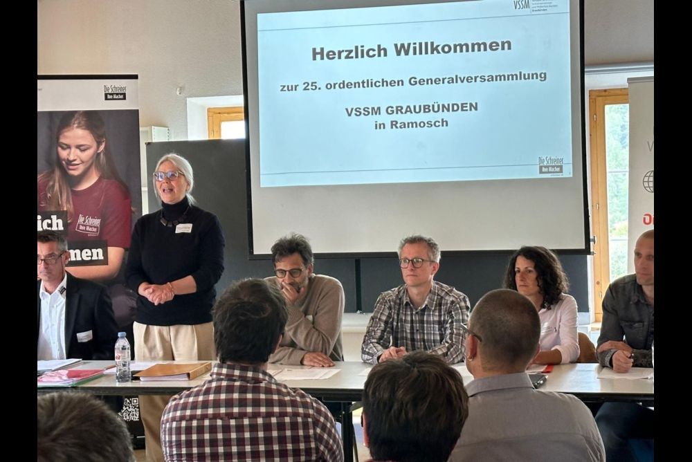 Wahlen standen auf dem Programm der gemeinsam abgehaltenen Generalversammlungen vom Verband Schweizerischer Schreinermeister und Möbelfabrikanten des Kantons Graubünden und Holzbau Schweiz Sektion Graubünden vom 19. April 2024 im Schulhaus in Ramosch. Remo Püntener aus Samedan ist an der 25. Generalversammlung des VSSM GR in Ramosch zum neuen Präsidenten gewählt worden. Er tritt die Nachfolge von Barbara Schuler-Rozzi aus Bergün an, die seit 2007 im Vorstand war und diesen seit 2014 präsidierte. In Anerkennung ihres unermüdlichen Einsatzes für den Verband ernannte die Versammlung Barbara Schuler-Rozzi zum Ehrenmitglied des VSSM GR.