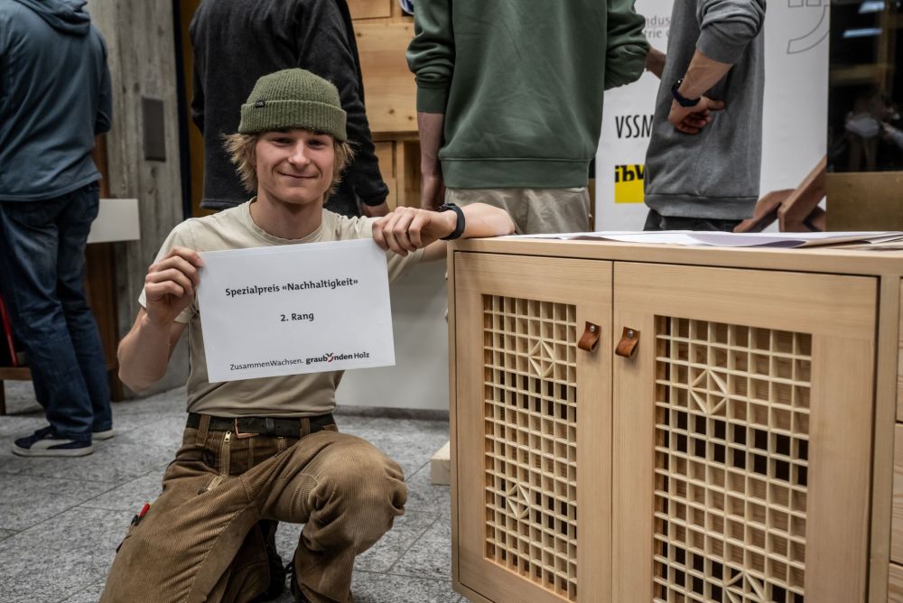 Erstmals wurde der Spezialpreis «Nachhaltigkeit» von Marcel Lerch, dem Geschäftsführer von Graubünden Holz, und Domenic Lanicca Vorstandsmitglied Graubünden Holz und VSSM Graubünden verliehen. Die Bewertung der eingereichten Arbeiten basierte auf drei wesentlichen Kriterien: der Verwendung von Massivholz, der Nutzung von Schweizer Holz, der ökologischen Oberflächenbehandlung sowie der sparsamen Verwendung von Metallbeschlägen.