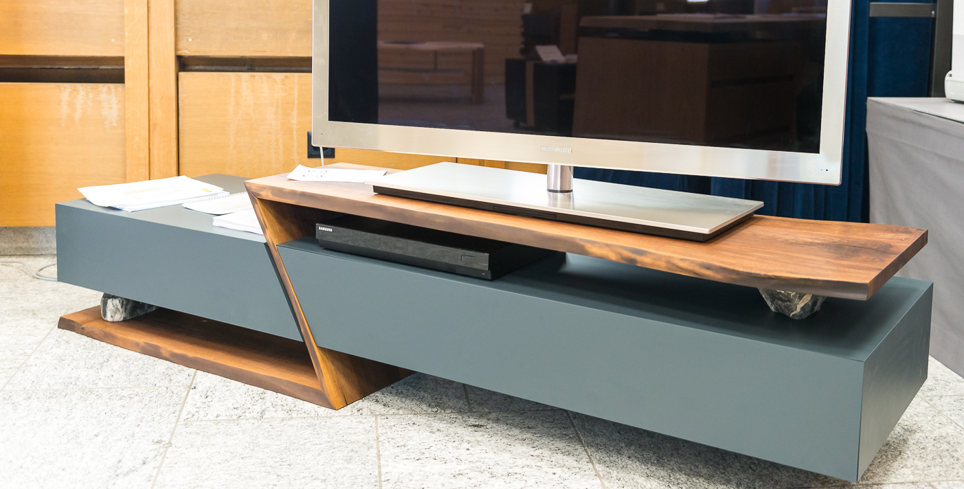 Dario Guler aus Klosters gewann mit seinem Sideboard aus Kirschbaumholz in der Form eines Parallelogramms den Lamello-Talentpreis. 100 Stunden hat er für sein Möbel aufgewendet und erhielt einen Preis von 2000 Franken in bar, gesponsert von Lamello.
