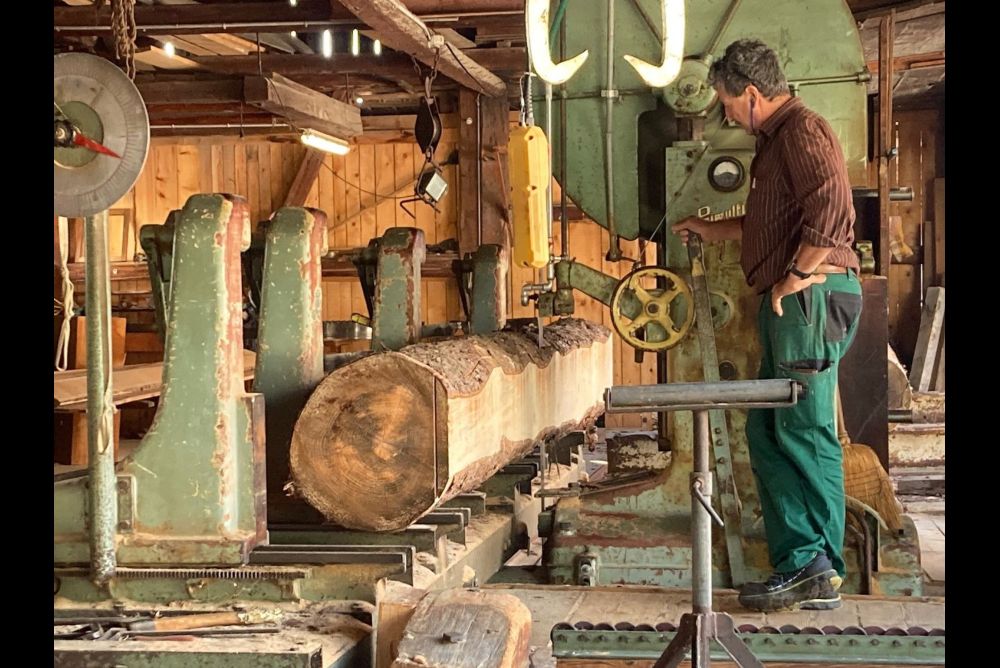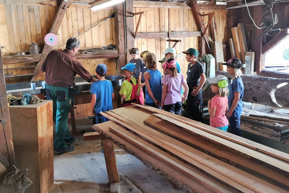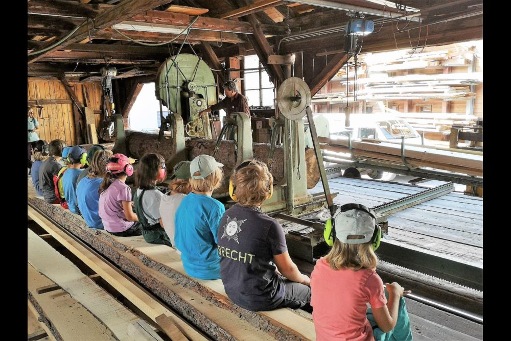 Bereits beim ersten Posten in der Sägerei von Ossy Just in Maienfeld machten die Kinder grosse Augen und stellten die ersten Fragen. Aus einer Fichte, welche über 100 Jahre lang in Maienfeld gewachsen ist, werden Bretter gesägt. "Diese Bretter verwenden wir für den Bau einer Innenverkleidung" erklärt Ossy Just. Mit einem Kontrollblick prüfen die Kinder, ob das Brett verzogen ist und ob die Äste gut verwachsen sind. "Aha", bemerkt eines der Kinder. "Also so werden aus unseren Bäumen die Bretter gesägt, damit man diese zu Möbeln oder Verkleidungen zusammenbauen kann".